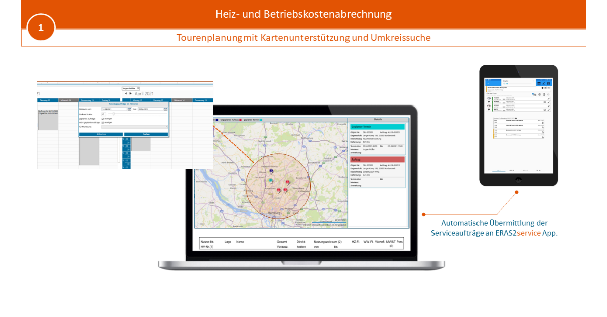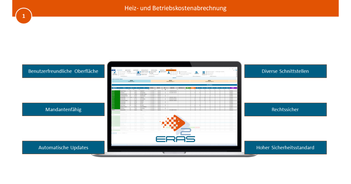 Vollständige Prozesskette von der Objekterfassung über die Mieterverwaltung bis zur Eigentümerinformation kennzeichnet die Architektur von ERAS2. Die Software deckt den gesamten Verwaltungslebenszyklus ab: Vertragsmanagement, Zahlungsabwicklung mit Mahnwesen, automatisierte Betriebs- und Heizkostenabrechnungen, Eigentümerabrechnung sowie technisches Gebäudemanagement. Besonders ausgeprägt ist die Verzahnung zwischen kaufmännischen und technischen Prozessen durch das integrierte TGA-Modul, das Instandhaltungskosten direkt mit der Buchhaltung verknüpft.