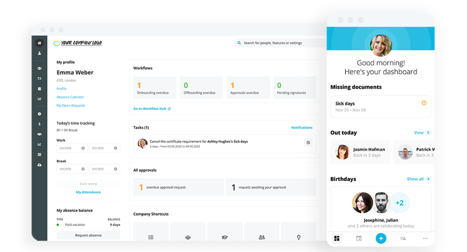 Intuitive Benutzeroberfläche speziell für HR-Laien entwickelt, ermöglicht schnelle Einarbeitung und hohe Akzeptanz bei allen Mitarbeitende im Unternehmen. Die moderne Oberfläche macht komplexe HR Prozesse auch für Nicht-Spezialisten zugänglich.