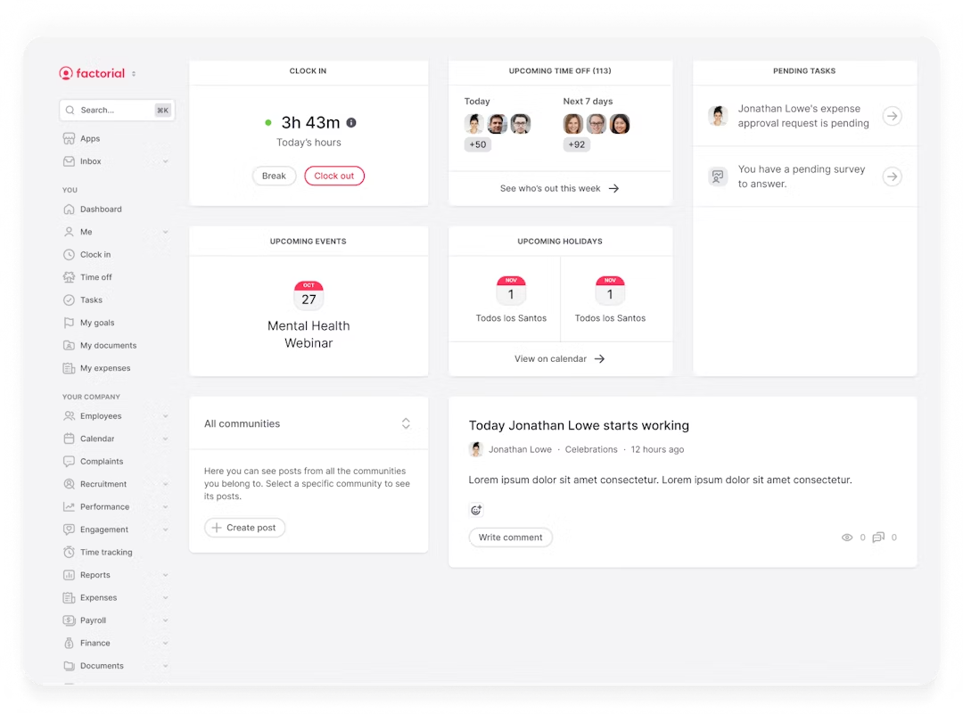 Factorial ist eine All in One HR Software, die Personalverwaltung, Abwesenheitsmanagement, Zeiterfassung, Gehaltsabrechnung und Performance Management in einer Plattform vereint. Die Lösung digitalisiert HR Prozesse von der Bewerbung über das Onboarding bis zur Mitarbeiterentwicklung und bietet sowohl Web- als auch Mobile-Anwendungen für alle Beteiligten. Teams können alle ihre Personalprozesse zentral verwalten und haben einen kompletten Überblick über alle Mitarbeiterdaten.