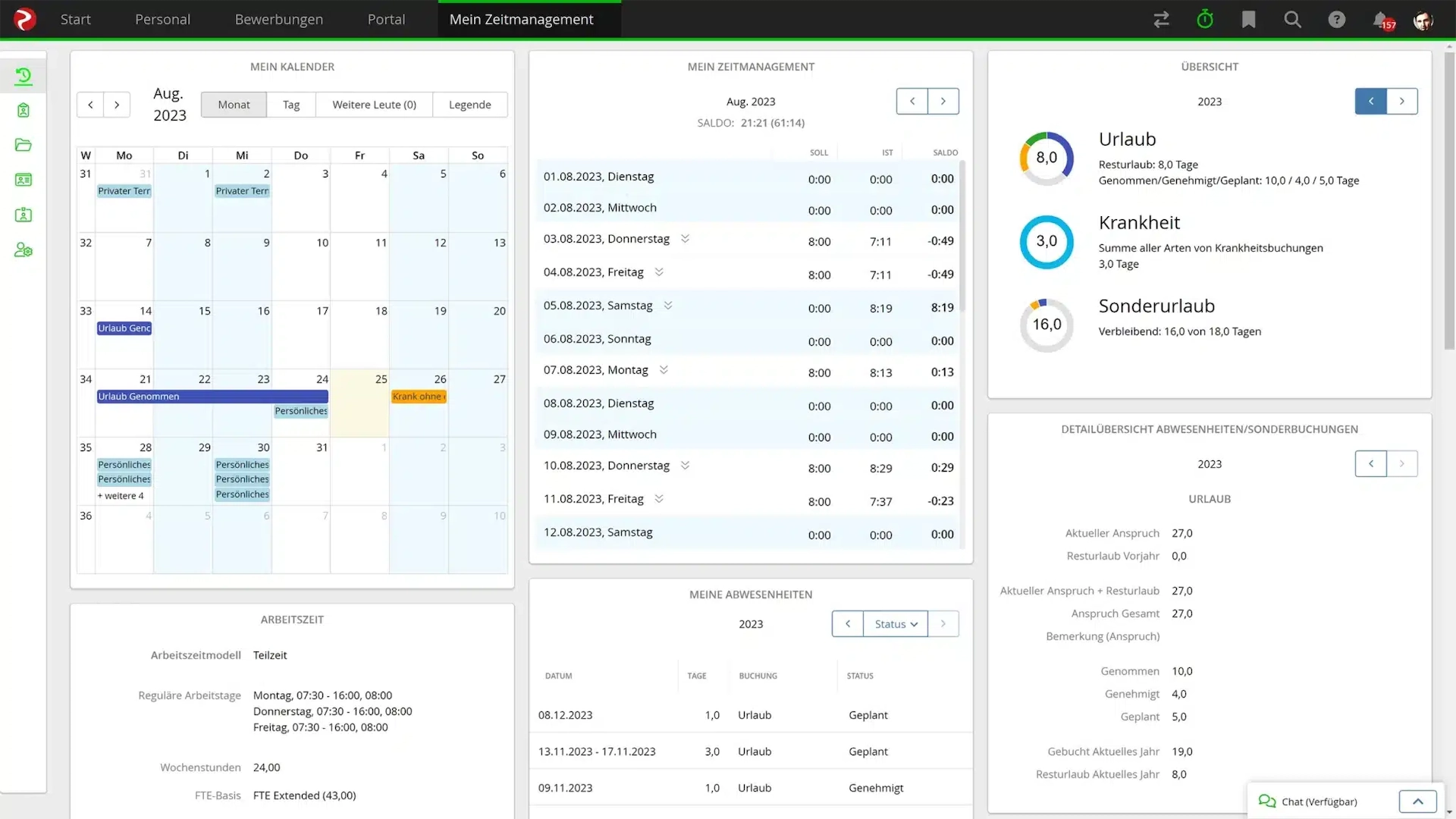 Zeit- & Abwesenheitsmanagement: Self Service Portal für Urlaubs- und Krankmeldungen mit automatischen Genehmigungsworkflows sowie flexible Arbeitszeit- und Gleitzeiterfassung. Manager können über die mobile App Genehmigungen erteilen, während Mitarbeitende eigenständig ihre Abwesenheiten verwalten. Die HR Tools bieten umfassende Funktionen für die Zeiterfassung und unterstützen HR Prozesse zur Personalplanung.