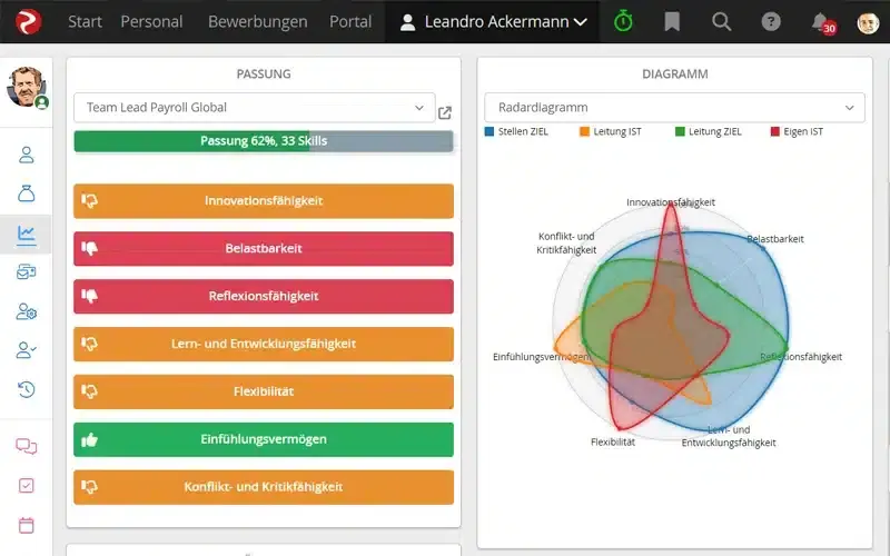 Performance & Entwicklung: 360 Feedback-System mit standardisierten Bewertungsvorlagen und umfassendes Talent Management mit Potenzialanalysen. Die Personalentwicklung profitiert von strukturierten Assessment-Prozessen und Nachfolgeplanungstools. Das Talentmanagement-Modul unterstützt HR Abteilungen bei der systematischen Förderung von Mitarbeitenden und der Identifizierung von Talenten im Unternehmen.
