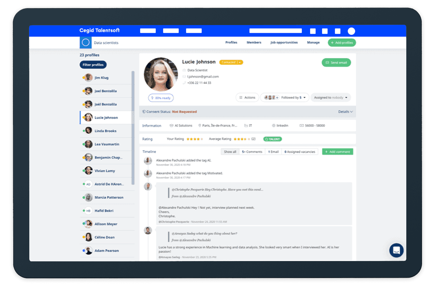 Bewerbermanagement & Recruiting: Das integrierte Applicant Tracking System (ATS) nutzt KI-gestützte Algorithmen für automatisches Kandidatenmatching und beschleunigt HR Prozesse signifikant. Das strukturierte Bewerbermanagement umfasst die komplette Candidate Experience von der Stellenausschreibung bis zur Einstellung. Talentsoft Cegid automatisiert wiederkehrende Aufgaben im Recruiting und verbessert so die Effizienz bei der Personalgewinnung in Deutschland.