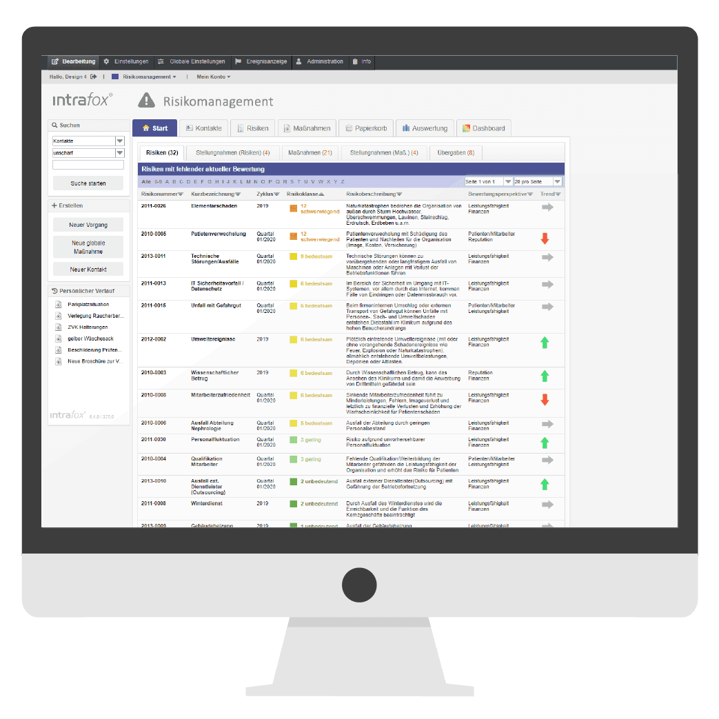 Das Intrafox Modul: Risikomanagement der Inworks GmbH ist geschaffen für Krankenhäuser, fürs Intranet oder Internet. Das Tool ist dabei abgestimmt auf das Integrierte Risikomanagement, dem Organisations-Risikomanagement sowie für die Monte-Carlo-Simulation. Elemente wie die Risikomatrix, Gefahrenliste und das Risiko-Dashboard sind in der Risikomanagement-Software ebenfalls enthalten, so dass Sie direkt damit arbeiten können.