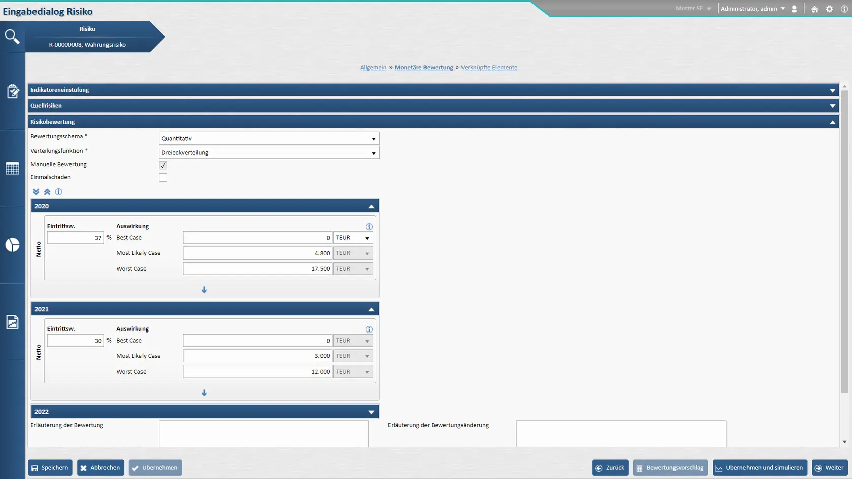 Sie können Bewertungen festlegen und das Restrisiko-Niveau dem Risiko-Toleranzniveau gegenüberstellen. So wissen Sie, in welchem Risikobereich sich das jeweilige Risiko befindet und wann es Zeit zum Handeln ist. Damit die Software für das Risikomanagement stets Up-to-Date bleibt, ergänzen Sie stets neue Risiken und detaillieren Sie die vorhandenen, um neu gewonnenes Wissen über Einflußfaktoren zu integrieren.