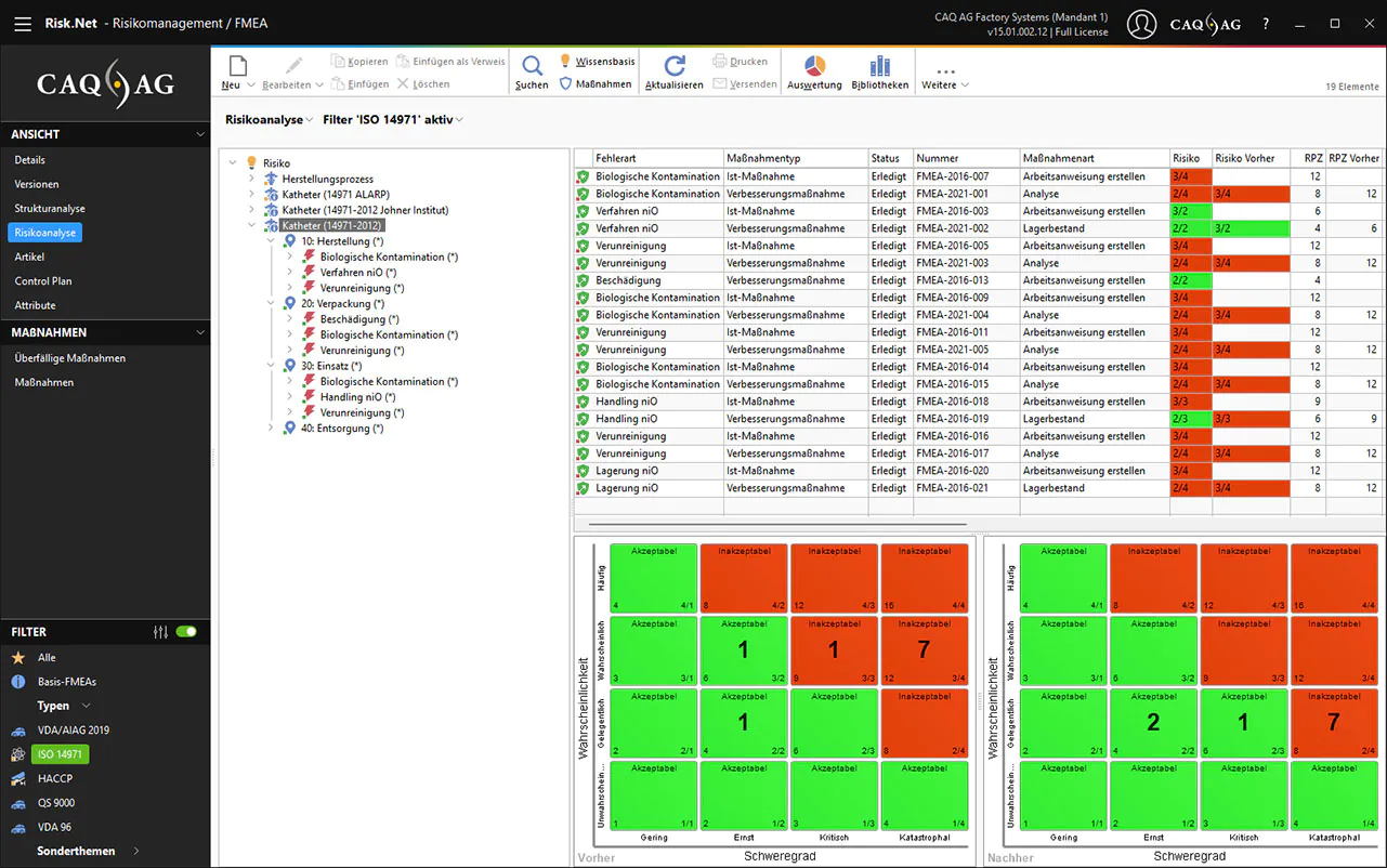 Mit der Risikomanagement-Software Risk .Net läßt sich das Risikomanagement, FMEA, Risikoanalyse und HACCP durchführen. Ebenfalls sind in der Softwarelösung die Risikomatrix, Strukturanalyse, Funktionsnetz und Ursachenanalyse enthalten. Dies ermöglicht das Erkennen, die Bewertung sowie die Dokumentation von Risiken im laufenden Geschäftsbetrieb. Die Eignung zur Erstellung AIAG / VDA konformer FMEAs sind dabei fachlich bestätigt.