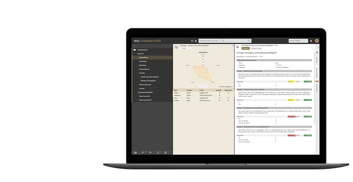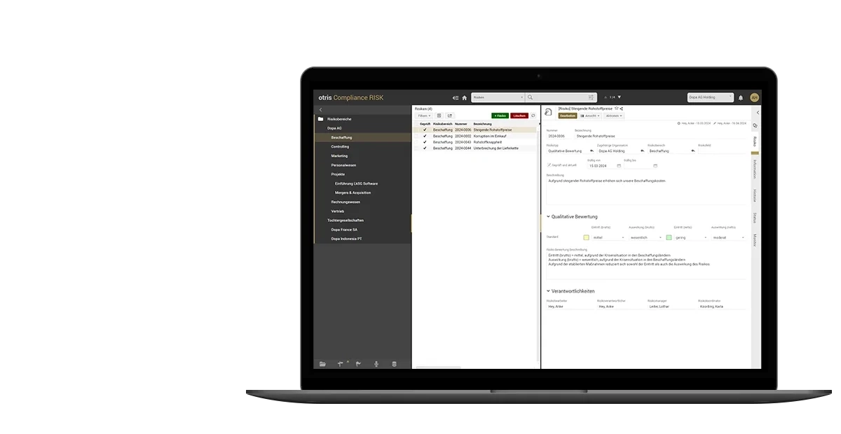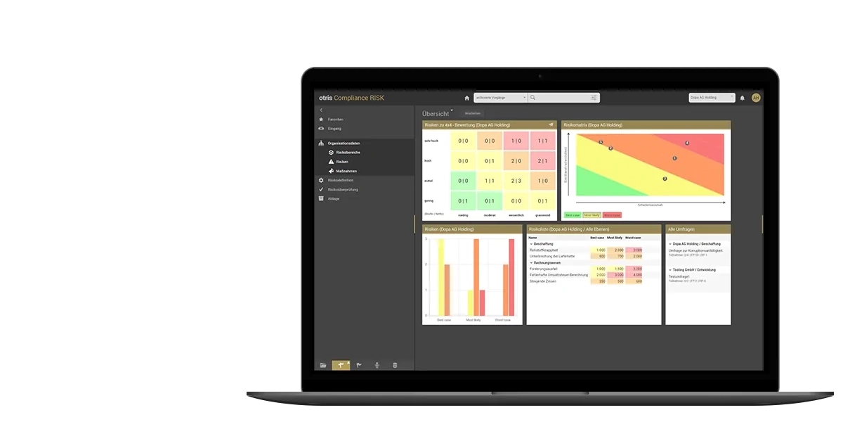 Die Software für Risikomanagement otris compliance der otris software AG ermöglicht es, Risiken in Unternehmen durch die stete Zusammenführung von Daten zu erkennen und sichtbar zu machen. Sie ermöglicht das Risiko-Assessment sowie eine Risiko-Analyse und bietet Tools für das Maßnahmenmanagement und das Reporting. Alles innerhalb einer Risikomanagementplattform.