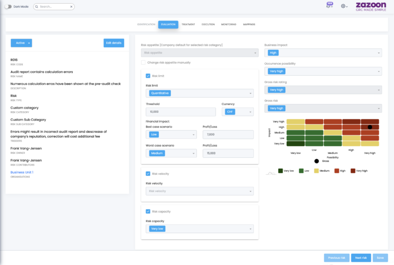 Mit dieser Risikomanagement Software können Sie auch eine Kalkulation der möglichen Auswirkungen vornehmen (bspw. Reputationsschaden, Sachschaden). Gleichzeitig können Sie geeignete Maßnahmen ableiten, um das Risiko/die Risiken zu minimieren. Ebenso können Sie aus der Softwarelösung erstellte Risiko-Dokumentationen verwenden, um die Risiken im Detail zu thematisieren und darauf aufmerksam zu machen.