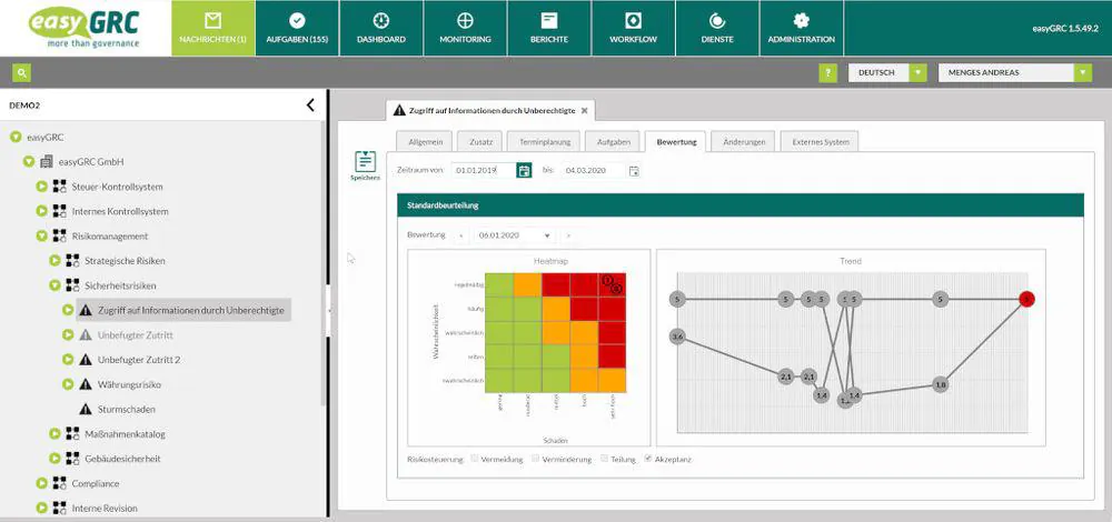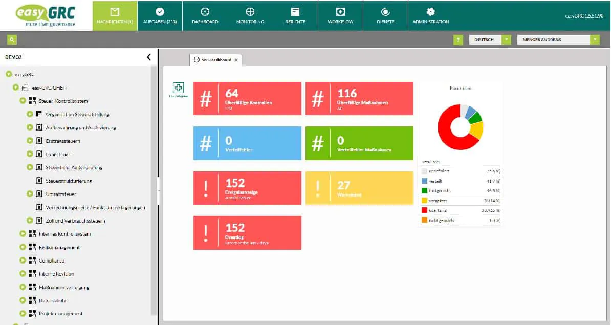 Das System bietet vorkonfigurierte Templates für Standards wie IDW PS 340 und unterstützt die Dokumentation von Kontrollaktivitäten mit Nachweis der Durchführung. Audit-Trails protokollieren alle Änderungen sowohl an Risiken als auch an Kontrollen für vollständige Nachvollziehbarkeit. Die integrierte Sichtweise reduziert Redundanzen und schafft Transparenz über die Gesamtwirksamkeit des GRC-Systems.