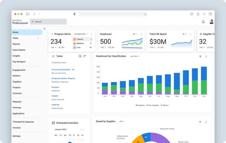 Beeline deckt den vollständigen Lifecycle des Vendor Managements ab. Von Supplier-Onboarding über Stellenausschreibung, Kandidatenauswahl und Zeiterfassung bis zur Rechnungsprüfung und Performance-Analyse arbeiten alle Prozessschritte in einer integrierten Plattform zusammen. Dies eliminiert Medienbrüche und schafft durchgängige Transparenz über den gesamten Prozess der Beschaffung und Steuerung externen Personals.